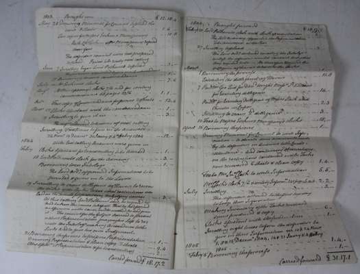 Account The Golfers of St Andrews &c. to Adam Bruce, writer in Edinburgh, eleven pages (9 pages of manuscript and a final blank) covering the solicitor's activities and disbursements during the period Feb. 20th 1803 to Aug. 25th 1807, while continuing the process of action in the Court of Session against the Dempsters over the use of the Linkspaper, paper watermarked 1805, contemporary sewing