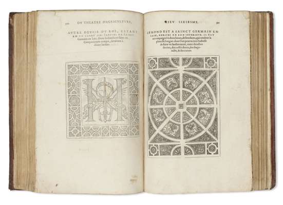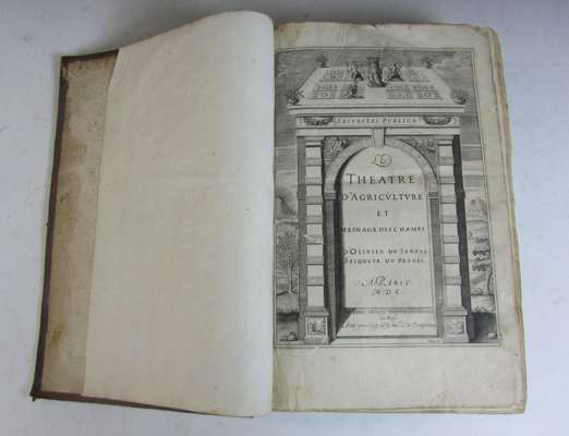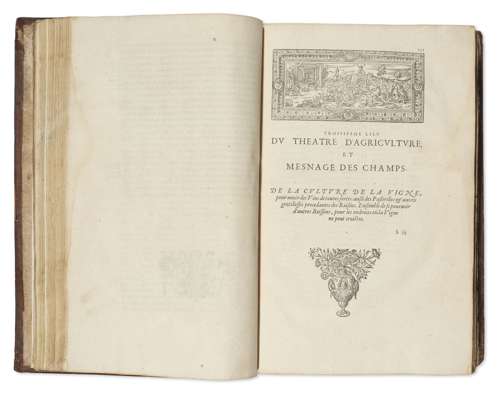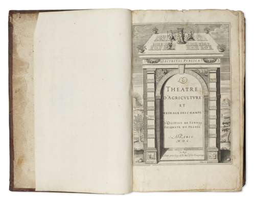 Le théâtre d'agriculture et mesnage des champs. Paris: Jamet Métayer, 1600. 4to, engraved title-page, woodcut headpieces and initials, 8 rectangular woodcuts and 16 ?engraved illustrations in the text, contemporary calf, rebacked, gilt tooled wreaths to boards, Sinclair bookplate to paste-down endpaper, marginal dampstaining, a couple of tears to corners and closed marginal tears, pages occasionally a little creased, a few rust stains occasionally affecting letters, some binding errors (pp.667-668 bound following page 670; pp.789-790 bound before page 787; additional copy of quire 5H), very minor marginal worming to signature 4F, marginal repair to page 857 with no loss of text, joints and hinges once repaired but beginning to split, some rubbing to spine and covers, very slight worming to upper cover