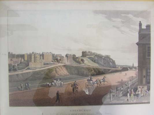 Three views of Edinburgh, engravings, each 473x668mm, hand-coloured, framed and glazed, laid down, the first showing A view of the old town taken from Princes Street (some slight marginal spotting), the second showing A view of the old town taken from Princes Sreet but looking back towards North Bridge, the third showing A general view of Edinburgh from the North West (general browning) (3)