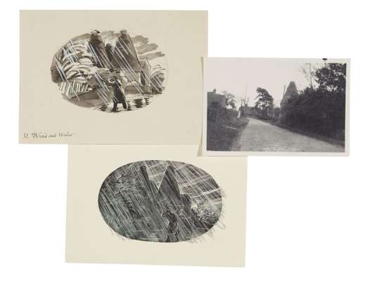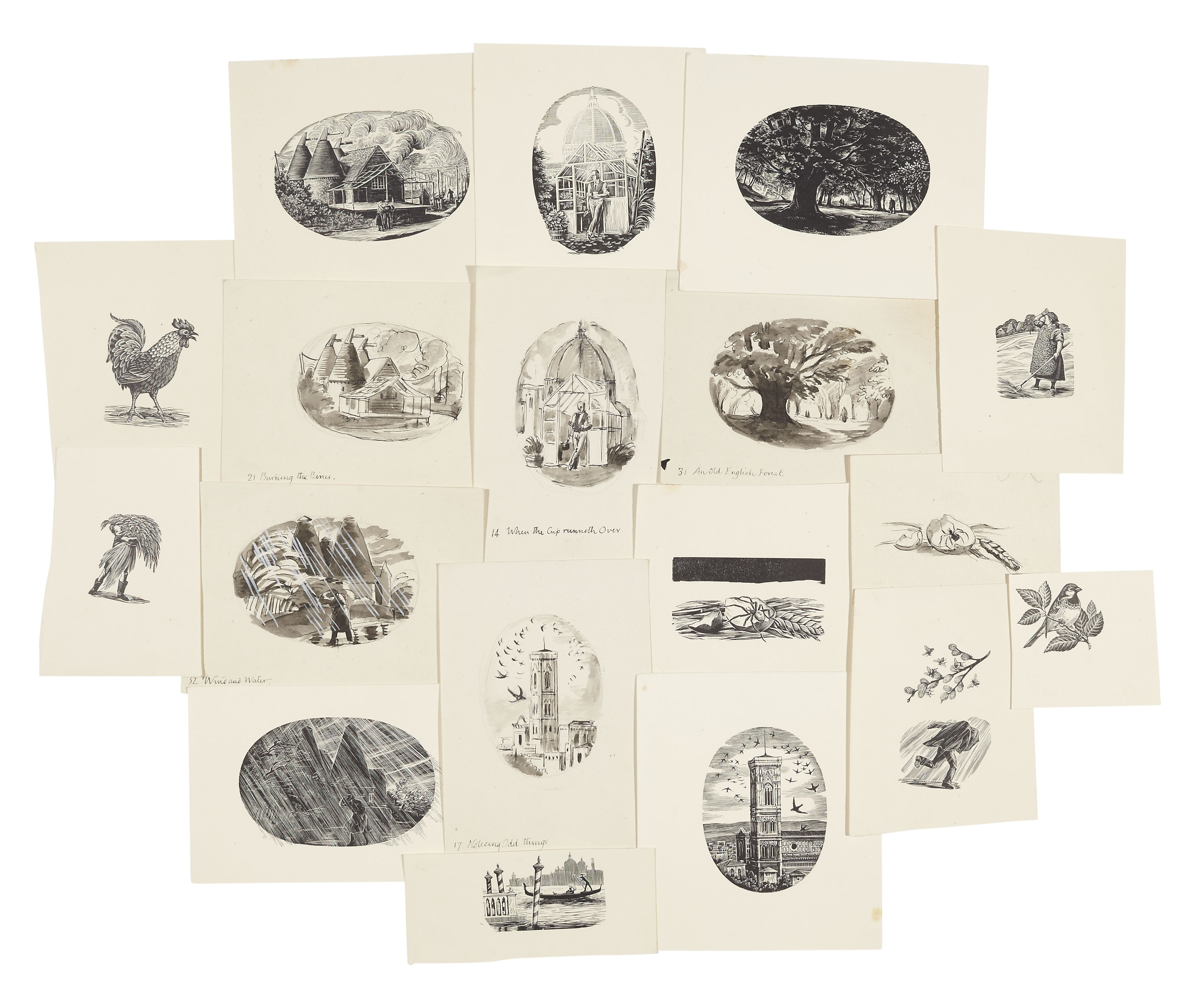 24 original pen and wash drawings numbered (between 4 and 42) and captioned in ink by Joan Hassall, most c. 6 x 9cm., 13 accompanied by a finished wood-engraving (not signed); 11 other unsigned wood engravings, a few cut close, and 4 photographs, probaby by Hassall, of coast houses and Venice used as models for the drawings & wood-engravings