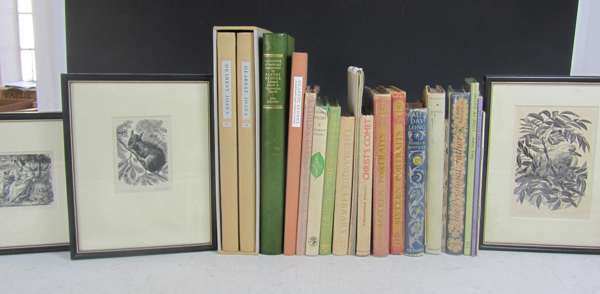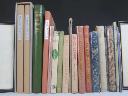Dearest Joana. A selection of Johan Hassall's lifetime letters and art. Denby Dale: Fleece Press, 2000. 2 volumes, 4to, limited to 200 copies, cloth-backed marbled boards, slipcase; Lee, Brian N. Dearest Sydney. Joan Hassall's letters to Sydney Cockerell. Fleece Press, 1991. 8vo, limited to 220 copies, cloth-backed patterned boards; Schroder, John Catalogue of books and manuscripts by Rupert Brooke, Edward Marsh and Christopher Hassall. Cambridge: Rampant Lions Press, 1970. 4to, limited to 450 copies, number XLV of 50 copies with an extra proof of the frontispiece signed by Joan Hassall, quarter green morocco by Sangorski & Sutcliffe, t.e.g., others uncut; Stevenson, R.L. A child's garden of verses. Edinburgh: Hopetoun Press, 1947. First edition, illustrations by Joan Hassall, presentation copy from Joan Hassall to "Topher & Eve, with love from Joana", dustwrapper chipped and frayed; Young, Andrew Collected poems. 1950, dustwrapper, wood engravings by Hassall; [Various authors] The Masque Library. 1950, wood-engravings by Hassall, dustwrapper; Heath, A. Opera and the gourmet. Calendar 1963. wood-engravings by Hassall; Strong, L.A.G. Sixteen Portraits. 1951. Wood-engraving by Hassall, presentation copy "To Greta with best love from Joan Hassall, 23 Nov. 1967", dustwrapper; [Idem] another copy, dustwrapper; Whitlock, P. All day long. 1954. 8vo, wood-engravings by Joan Hassall, presentation copy "To Topher with love from Joan", dustwrapper soiled with slight loss; N.B.L. Reader's guides A reader's guide. Wood-engraving by Joan Hassall, 1949. 2 copies, 8vo, wrappers; Hassall, Christopher Penthersperon. [N.d.], 8vo, title-page by Joan Hassall, original cloth, dustwrapper; Dickinson, W.C. The sweet singers. 1953. 8vo, illustrations by Hassall, original stiff boards; 5 others illustrated by Hassall, & 3 wood-engravings by Joan Hassall [The Young Pigeon, The Red Squirrel, The Cowslip Ball], each c. 80x105mm,