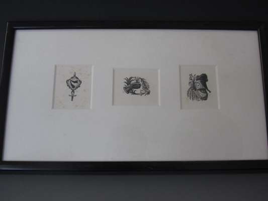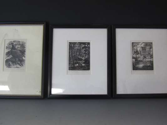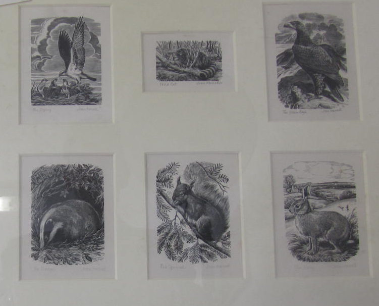 2 framed "Acknowledgment Proofs", depicting 58 numbered wood-engravings two sheets, one engraving cut round and put the correct way up, framed and glazed; Framed print of 6 wood-engravings: The Osprey, Wild Cat, The Golden Eagle, The Badger, Red Squirrel, The Hare, 4 numbered /30, one /10, one unnumbered; Framed print of 3 wood-engravings of armorial designs; and 4 framed prints: Lavaine & Lancelot, /5, signed; Golden Eagle, /30, signed; Young Starling, unnumbered, signed; The Barge at Westminster, /5, signed, average size 100x80mm (8)