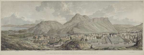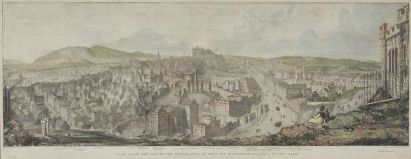 The city of Edinburgh taken from the Calton Hill - four panoramic views of Edinburgh. Edinburgh: William Fairborn, 1823, 252x633mm each, hand-coloured, framed and glazed, laid down, comprising: View from the top of the Calton Hill, looking to the North (a couple of neat repairs), View from the door of Nelson's monument on the Calton Hill, looking to the East (a few instances of loss to engraved area, which have been coloured in), View from the walk on the top of the Calton Hill, looking to the South, view from the top of the Calton Hill by Nelson's monument, looking to the West some slight marginal dust-soiling and a few marginal repairs (4)