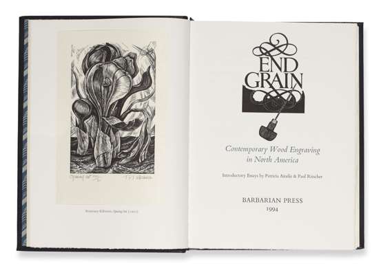 Endgrain. Contemporary wood engraving in North America. Mission, B.C., Canada: Barbarian Press, 1994 [i.e. 1995], large 8vo, limited to 300 copies, one of 50 bound in full morocco and with a signed proof engraving by Rosemary Kilbourn tipped in as frontsipiece, number 21 of 50 copies signed by Crispin and Jan Elsted, morocco-backed book-form box