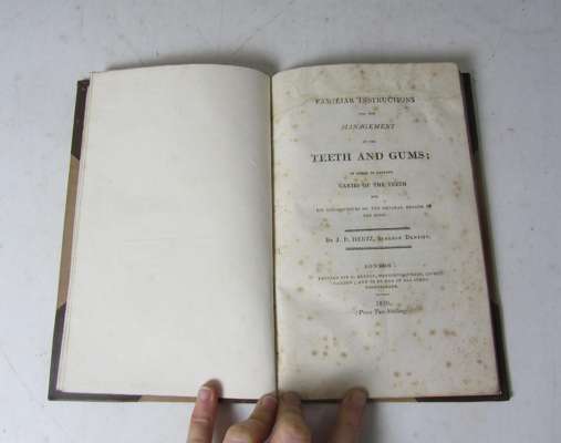 Familiar instructions for the management of the teeth and gums. London: R.Burton, 1810. First edition, 8vo, hand-coloured engraved plate, modern brown quarter morocco gilt, paper repair to upper blank margin of title not affecting the text, some spotting [Menzies Campbell 64, Crowley 1542]