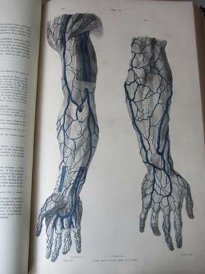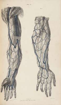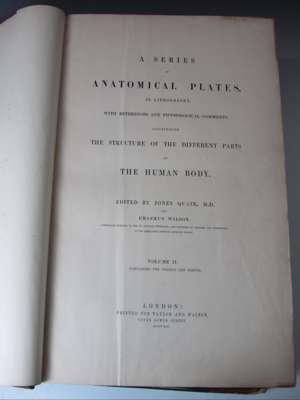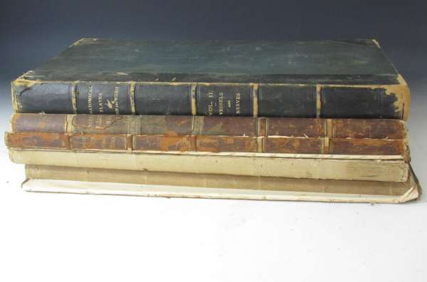 A series of anatomical plates, in lithography... volume II, containing the vessels and nerves. London: Taylor and Walton, 1842 and 1839. Folio, 88 engraved lithographs, mostly coloured, contemporary half morocco, a little darkening and spotting, several plate margins strengthened on verso, 4 library stamps of Dr Geo. Henderson, rubbed; [Idem] The muscles of the human body. London: Taylor and Walton, [1836-42]. Folio, engraved frontispiece, 50 engraved plates, some coloured, contemporary half-calf, title-page torn with some loss, some spotting and browning, upper cover and spine lacking, lower cover detached; [Idem] The nerves of the human body. London: Taylor and Walton, 1839. Folio, 37 (of 38) engraved plates (plate 21 lacking), contemporary half calf, many plates spotted, spine lacking, upper cover detached; [Idem] Viscera of the human body. [London: Taylor and Walton, 1836-42]. Folio, 32 engraved plates, contemporary half calf, lacking title-page, some browning, dust-soiling and spotting, upper cover lacking, lower cover detached; [Idem] [The vessels of the human body. London: Taylor and Walton, 1836-42?] Folio, 49 (of 50) engraved plates (plate 1 lacking), some coloured, lacking title-page and advertisement leaf, dust-soiling, spotting, browning, lacks covers; sold not subject to return (5)