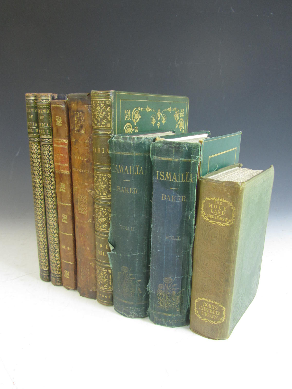 Syria, the Holy Land and Asia Minor... London: Fisher, Son, & Co., 1836-8. 3 volumes in 2, 4to, 3 engraved titles, 2 maps, 117 engraved plates, volumes 1 and 2 bound together, contemporary half calf, some spotting and dust-soiling, volume 3 in contemporary green morocco gilt, g.e., some browning and spotting, spine rubbed and faded, corners bumped; Roberts, Emma Views in India, China and on the shores of the Red Sea. London: Fisher, Son, & Co., 1835. 2 volumes, 4to, engraved titles, 2 frontispieces (one coloured) and 60 engraved plates, contemporary half calf with gilt tooled spines, previous owner's signature to first free endpaper, some foxing, slight rubbing to binding, spines a little faded; Walsh, Robert Constantinople... London: Fisher Son & Co., [1839?] 4to, one volume only (second series), engraved title-page, frontispiece, double-page map and 47 engraved plates, contemporary half calf, some pencil annotations, binding a little rubbed; Baker, Sir Samuel W. Ismailïa. London: MacMillan and Co., 1874. 2 volumes, 8vo, portraits, volume 1 lacking map, map from volume 2 tucked into pocket in volume 1, original cloth gilt, hinges repaired with tape, some soiling, bindings very rubbed, spines peeling; and one other (8)
