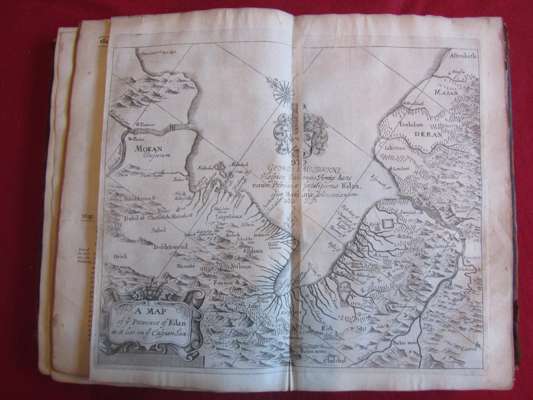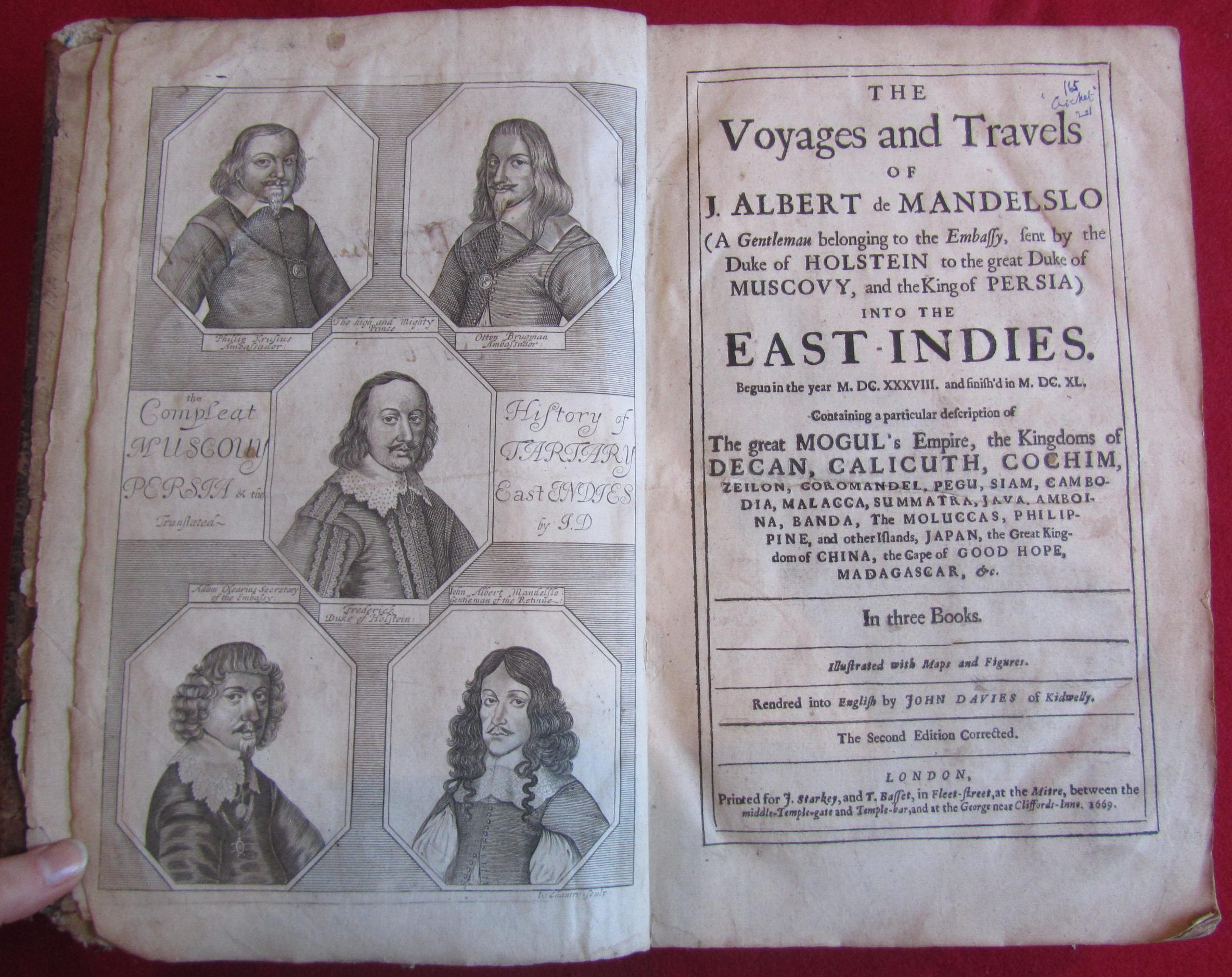 The voyages and travels of J. Albert de Mandelslo... into the East Indies. London: J. Starkey and T. Basset, 1669. Second English edition, 4to, 2 plates and 3 (of 6) folding maps, contemporary calf, some slight dampstaining and creasing to pages, occasional spotting, slight dust-soiling, some small tears, covers chewed, joints split, calf rubbed and lacking in places