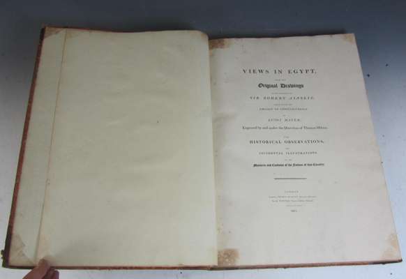 Views in Egypt... London: Thomas Bensley, 1801. Folio (page dimensions: 46.8x35cm), 48 hand-coloured aquatints, contemporary half calf with marbled boards, sensitively rebacked, a little foxing and darkening to title-page and dedication leaf, especially at corners, very light foxing to text, some slight offsetting onto text, occasional very minor marginal foxing and dust-soiling to plates, covers a little rubbed and darkened