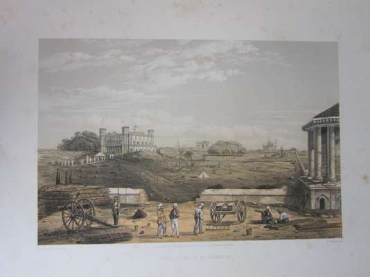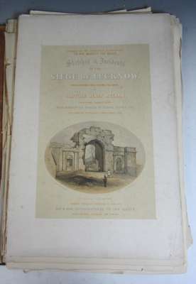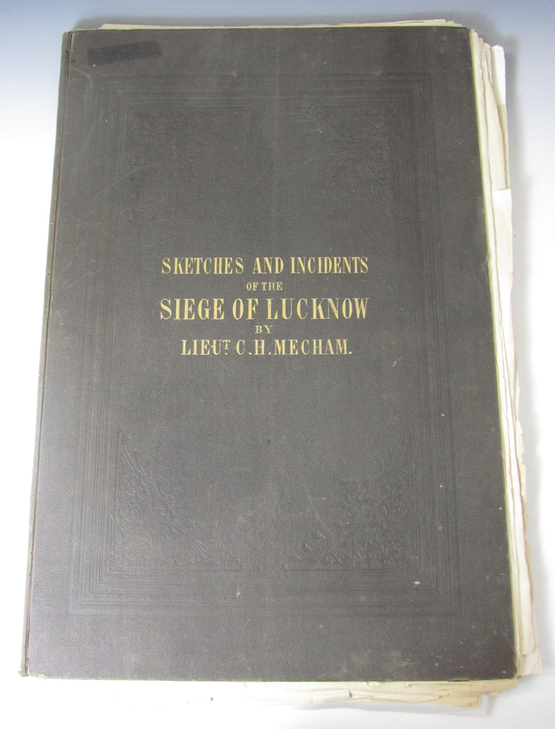 Sketches & Incidents of the Siege of Lucknow... London: Day & Son, 1858. Folio, lithographic title-page and 27 views on 17 plates (including title-page), loose in original gilt cloth covers, some spotting and edge wear, covers a little soiled and faded, with 7 additional hand-coloured lithographs from William Simpson's The Seat of the War in the East, 1855-56