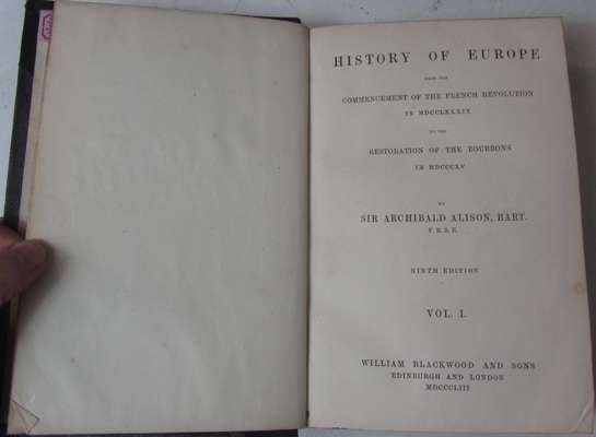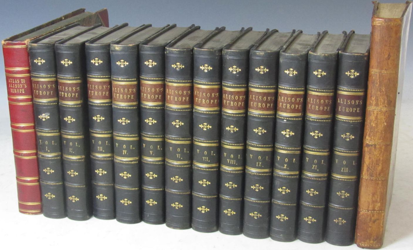 History of Europe. Edinburgh: William Blackwood and Sons, 1853. Ninth edition, 8vo, 12 volumes, black half calf with red labels and gilt tooling to spines, previous owner's bookplates to paste-down endpapers, occasional light spotting and dust-soiling, covers, end of spines and corners a little rubbed; [Idem] - Johnston, Alexander Keith Atlas to Alison's history of Europe. Edinburgh: William Blackwood and Sons, 1848. Small oblong 4to, frontispiece and 99 maps (one folding), many coloured in outline, bookplate to paste-down endpaper, contemporary red half morocco, some slight offsetting and marginal dampstaining, closed tear to folding map of Europe, a little rubbing to covers and spine; Burke, Edmund Reflections on the revolution in France... London: J. Dodsley, 1791. Eleventh edition, 8vo, contemporary calf, bookplate to paste-down endpaper, occasional spotting, a few small marginal tears, covers slightly rubbed (14)