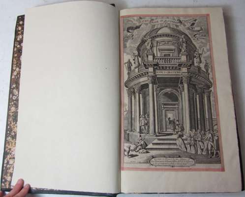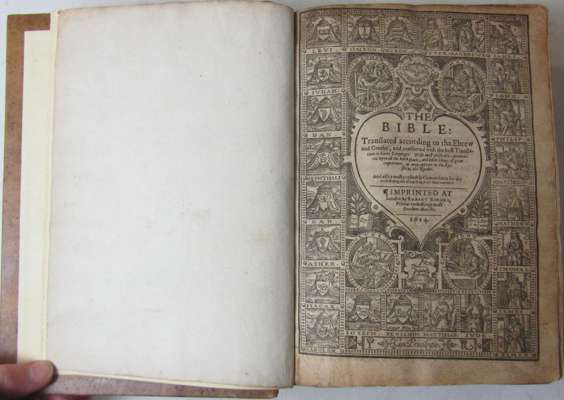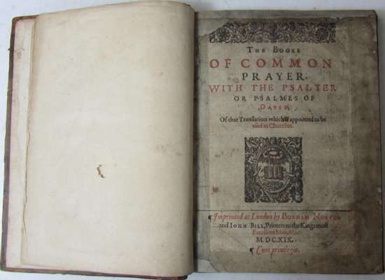 London: John Baskett, by the Assigns of Henry Hills, 1724. Large 4to, title in red and black, engraved title laid down, dated 1710, ruled in red throughout, contemporary panelled morocco with gilt tooled Royal coat of arms to covers, rebacked with modern spine, title-page repaired in lower corner, A1 and several other pages repaired with loss of a few words, some dust-soiling throughout, covers a little rubbed [ESTC T87247]; The Book of Common Prayer with the Psalter or Psalmes of David London: Bonham Norton and John Bill, 1619. 8vo, small hole to B7 with loss of a couple of letters [ESTC 123375; STC 16351 or 16352]; Bound with 'J.S.' [Speed, John] The genealogies recorded in the sacred scriptures according to every family and tribe. [London: J.Beale, c.1612?] [Probably ESTC S101955; probably STC 23039d]; And bound with an edition of the Aprocrypha, bookplates to endpapers including that of Rear Admiral Thomas Western of Tattingston Place, contemporary calf, sensitively rebacked and repaired in places, with later spine, some dust-soiling, particularly to title page; Bible London: Robert Barker, 1614 [New Testament title page dated 1613]. 4to in eights, two elaborately engraved title-pages (Old and New Testaments) with vignettes showing prophets and Apostles, inscription in an early hand on blank page between the Apocrypha and New Testament dated 1666, modern calf, several leaves lacking and many pages lacking side-notes and page numbers in upper- and fore-margins due to binder's trimming, a few repairs with loss of some words, browning, full condition report available upon request [ESTC S1399; STC (2nd edition) 2232] (3)