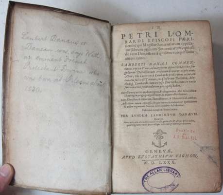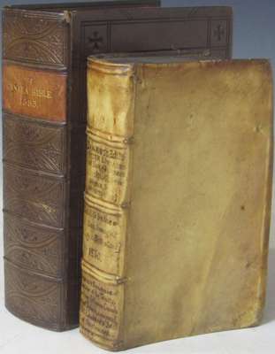 In petri lombardi episcopi parisiensis [Danaeus's edition of Peter Lombard's first book of sentences]... Geneva: Evstathium Vignon, 1580. 8vo, contemporary? vellum, includes Synopsis section, some pages uncut, previous owners' bookplates, including that of David Maitland Titterton, and library stamps of The Allan Library and a German library to title, page 401 and page 23 of Synopsis, marginal repair to pages 341-2 with no loss of text, many pages darkened and a little spotted or dampstained, a little darkening to covers, English title to spine in ink; The Bible [Geneva Version] London: Christopher Baker, 1583 [1584]. 8vo, engraved title-pages (Old and New Testaments) and woodcut initials, 19th century? embossed calf with label to spine reading The Geneva Bible, 1583, some letters and page numbers lacking where margins have been trimmed, several ink notations in an early (18th century?) hand including inscriptions on blank sides of a couple of leaves, several holes and repairs with loss of up to several words, 2Q8-2R6 (leaves numbered 312-318) and 3D1 lacking, engraved Old Testament title laid down, some browning, dust-soiling and spotting, A1 and A2 of liturgical section of book lacking, this section includes some slight dampstaining, [ESTC S483096 (title and imprint from 1583 edition: STC 2136.5]; bound with The whole booke of psalmes... London: John Day, 1583. Small 4to, engraved title page, dust-soiling and marginal repairs with no loss of text [ESTC S90636, STC (2nd edition) 2464); Sold not subject to return (2)