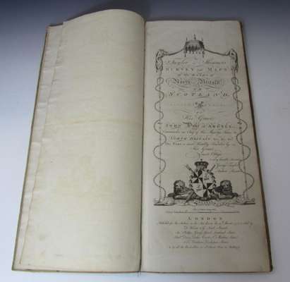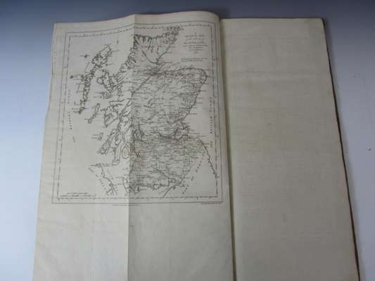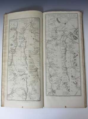 Survey and maps of the roads of North Britain or Scotland. London: D. Wilson..., 1776. Oblong folio, 61 maps on 31 sheets, and folding map of Scotland, contemporary suede with red morocco label to upper cover reading 'Taylor & Skinner's Roads 1777', bookplate of 'Brown of Waterhaughs' to paste-down endpaper, covers a little marked and rubbed with faint blue writing to lower cover