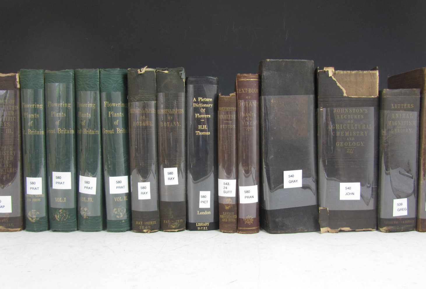 English physician and complete herbal... London: printed by W.Lewis for the proprietor, 1813/1812. Thirteenth and fifteenth edition, 4to, 2 volumes in one, engraved portrait and 39 (of 42) hand-coloured plates, contemporary calf, pp.217-240 lacking; Berthollet, C.L. & A.B. Elements of the art of dyeing. 1824. 2 volumes, 8vo, 9 folding plates, half calf; Moore, Thomas The nature printed British ferns. London: Bradbury & Evans, 1859-60. 2 volumes, 8vo, 120 (of 122) coloured plates, some foxing, library stamps to title-pages, several inner pages and on reverse of plates, half morocco, a little foxing; Pratt, Anne The flowering plants of Great Britain. SPCK, [n.d.]. Volumes 1-3 (of 5), and The Grasses, sedges and ferns of Great Britain. SPCK. [n.d.], coloured plates, uniform green cloth gilt; Gray, Samuel F. The operative chemist. 1828. 8vo, engraved plates, lacks p.559, quarter vellum; Henfrey, A. Reports and papers on botany. 1846 & 1849. 2 volumes; Johnston, J.F.W. Lectures on agricultural chemistry and geology. 1847. 8vo, spine very worn; Gregory, William Letters to a candid inquirer on animal magnetism. 1841. 8vo, original cloth; Day, G.E. Chemistry in its relations to physiology and medicine. 1860. 8vo, 5 plates, original cloth; Knapp, F. Chemical technology. 1848. 2 volumes, 8vo, original cloth; Ottley, William C. A dictionary of chemistry and of mineralogy. 1826. 2 plates, half calf, covers detached; Noad, Henry M. Chemical manipulation and analysis. 1852. 8vo, original cloth; Liebig, Justus Chemistry its applications to agriculture and physiology. 1843; Roscoe, Henry E. Spectrum analysis. 1869. 8vo, original cloth; all with RCSI library stamps, some dust-soiling and spotting, many bindings worn and somewhat dust-soiled; sold not subject to return (quantity)