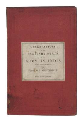 Observations... on the sanitary state of the army in India. London: Edward Stanford, 1863. 8vo, engraved illustrations, including a double-page view of soldiers in hospital on pages 40-41, original red cloth with paper label to upper board, RCSI library stamps in black ink to title-page and on three occasions throughout text, also blindstamps, title-page and margins slightly darkened, some soiling to covers, lower joint splitting, lacking final blanks