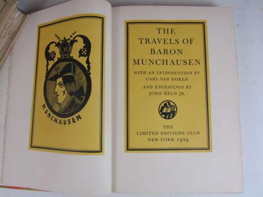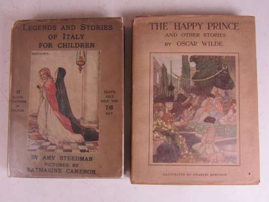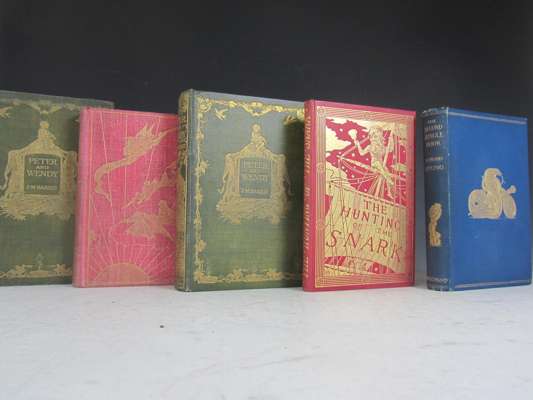 Barrie, J.M. Peter and Wendy. London, [1911]. First edition, 8vo, illustrations, original pictorial cloth gilt; The travels of Baron Munchausen. New York: Limited Editions Club, 1929. Limited to 1500 copies, illustrations by John Held, quarter morocco, rubbed & soiled; Balzac, H. de Ten droll tales. 1926. Limited to 3000 copies, illustrations by Jean de Bosschere, worn dustwrapper; Steedman, A. Legends and stories of Italy for children. [c.1910], plates by Katharine Cameron, worn dustwrapper; Carrick, Valery Picture tales from the Russian. 1913; More Russian picture tales. 1914; Still more Russian picture tales. 1915; Andersen, H. Fairy tales. 1911. 24 plates by Cecile Walton, worn dustwrapper; Wilde, O. The happy prince. 1920. 4to, illustrated by Charles Robinson, dustwrapper slightly frayed; Steel, Anne English fairy tales. 1918. 8vo, plates by Arthur Rackham, original cloth, faded; Dulac, Edmund Picture Book for the French Red Cross. 1918. 4to; Dulac, Edmund Fairy Book. [c.1918]. 4to, somewhat dust-soiled; Praeger, S.R. How they went to school. [c.1910]. Oblong 4to, cloth-backed boards, boards soiled and rubbed; Willebeek Le Mair, H. Little songs of long ago. [N.d.] Dustwrapper soiled; [Idem] Old Dutch nursery rhymes. [N.d.]. Dustwrapper soiled; [Idem] Our old nursery rhymes. [N.d.]. Dustwrapper soiled; Kingsley, C. The water babies. Boots, [n.d.]. 4to, illustrations by Jessie W. Smith, binding marked; Dodgeson, C.L. Alice's adventures in wonderland. Boots, [n.d.]. 4to, binding slightly marked; Nichols, Beverley A book of old ballads. 1934. 4to, 2 copies, illustrated by H.M. Brock, original suede, spines faded; Dodgeson, C.L. The hunting of the snark. 1903; Kipling, R. The second jungle book. 1895. First edition, ownership inscription on half-title, original cloth; Detmold, Edward J. The fables of Aesop. Hodder & Stoughton, [n.d.]. 4to, coloured mounted plates, original pictorial cloth; and 30 others, most a bit dust-soiled; sold not subject to return (49)