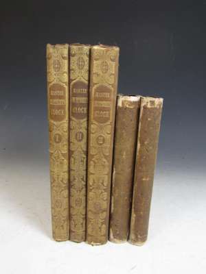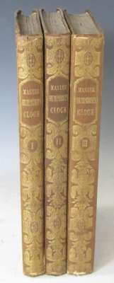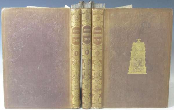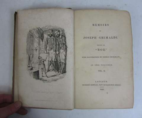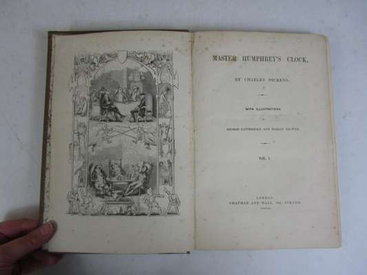 Master Humphrey's clock. London: Chapman and Hall, 1840-41. First edition in book form, 3 volumes, 8vo, 3 frontispieces, wood-engravings in text by George Cattermole and Hablot K. Browne, original purple-brown straight-grained cloth, covers decorated with blindstamped design surrounding clock blocked in gilt, slightly spotted, bindings somewhat faded, head and tail of spines rubbed [Eckel, pp. 61-65]; [Idem] Memoirs of Joseph Grimaldi. London: Richard Bentley, 1838. First edition, first issue in pink cloth, and with "The last song" plate without a border, engraved frontispiece and 12 etched plates by George Cruikshank, half-titles, original pink embossed cloth, 36 pp. advertisements at end of volume 2, spines worn, corners rubbed [Eckel, p. 152] (5)