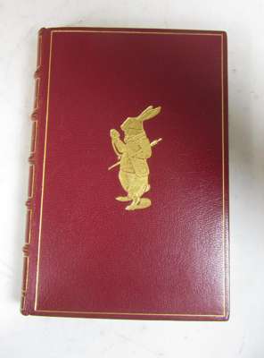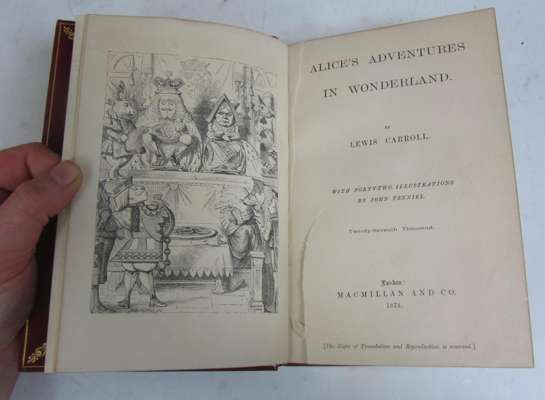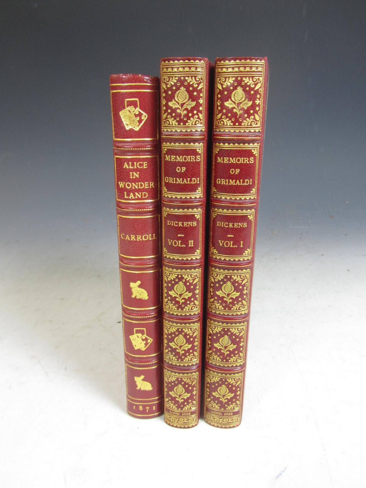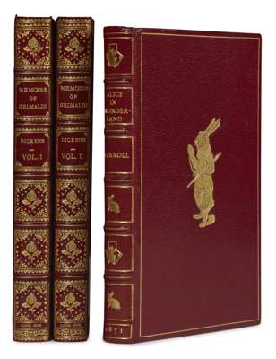 Alice in wonderland. London: Macmillan and Co., 1871. 'Twenty-seventh thousand', 8vo, red morocco gilt by Bayntun with the White Rabbit inspecting pocket watch to upper cover and rabbit and playing card motifs along spine, g.e., original cloth bound in at end, large 20th centuryy bookplate, 8cm. closed tear to title-page, tissue guard to frontispiece torn out leaving part still present; Dickens, Charles] Memoirs of Joseph Grimaldi. London: Richard Bentley, 1838. First edition, first issue, 2 volumes, portrait and 12 plates, red half morocco gilt, large 20th century bookplates, g.e., lacking advert leaves, without the border on plate 'The Last Song' (3)