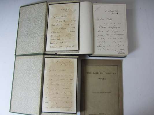 Reminiscences. London: Longmans, Green & Co., 1881. First edition, 2 volumes, 8vo, both volumes with A.L.S. from Froude to John Skelton (1831-1897), original green cloth; [Idem] The two chiefs of Dunboy. London: Longmans, Green & Co., 1889. First edition, with A.L.S. to John Skelton, "you must take me to Loch Leven & I want to make out Carberry Hill & to seat myself on Queen Mary's stone. Also I must examine Langside... & if possible Borthwick Castle. The story grows wilder & grander the more I know of it...", 6 Clifton Place, 29 June 1864, publisher's "From the author" slip bound in, original green cloth gilt ; [Stephen, Sir James] The late Mr Carlyle's papers. London: 1886. 8vo, Printed for Private Circulation, with A.L.S. from Froude to John Skelton "We are sending you Sir James Stephens' letter on the great Carlyle controversy - in return for the best article ever written - in The Scotsman of Wednesday, [1886], original wrappers lightly dust-soiled (4)