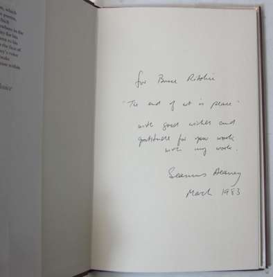 Note: Brandes & Durkan A20a, describing the covers as "dark-brown paper-covered boards." Inscribed on the front free endpaper by the author for Bruce Ritchie "The end of art is peace" with good wishes and gratitude for your work with my work. Seamus Heaney March 1983." Loosely inserted is an ALS and cover from the author as from 191 Strand Road, Dublin, 17 June 1983 inquiring as to whether he had returned to Bruce a couple of items sent earlier for signing. Heaney explains that he is just back from teaching at Harvard (the letter is on Harvard paper) "facing a cliff of unanswered letters."