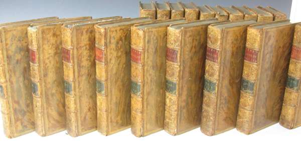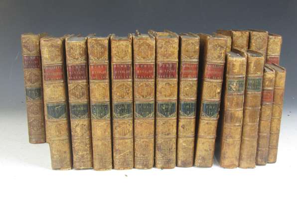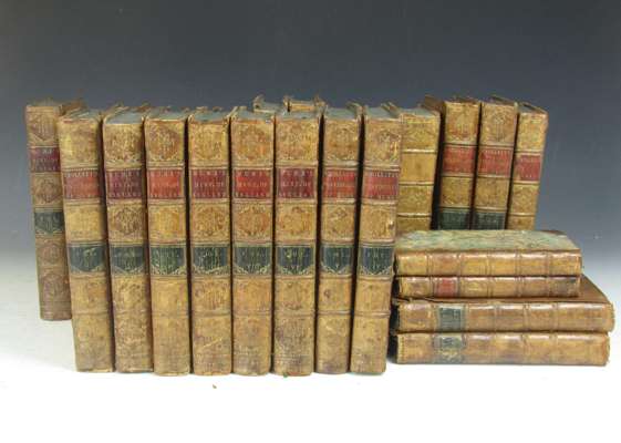 The history of England. London, 1792. 8 volumes, 8vo, engraved frontispiece; Smollett, T. The history of England [continued]. 1791. 5 volumes, 8vo, engraved frontispiece; [Idem] The miscellaneous works. Edinburgh, 1790. 6 volumes, 8vo, frontispieces, all contemporary tree calf gilt, rubbed; Swift, Jonathan Letters written by the late Jonathan Swift. London: T. Davies [&c.] 3 volumes, 8vo, contemporary calf, extremities rubbed, [ESTC T154629]; [Idem] Political tracts. London: C. Davies, 1738. 2 volumes, 8vo, contemporary calf, worn, two covers detached, [ESTC T43973]; Rousseau, Jean Jacques Confessions. Geneva: [no publisher], 1782. Part 1 & 2 only, 12mo, [2], 252; [2], 286; contemporary half calf, head of titles excised, lacks half-titles, worn, lower margin slightly wormed at end of volume 2 (25)