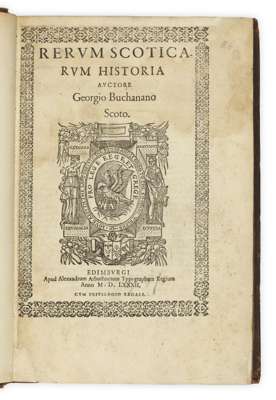 Rerum scoticarum historia. Edinburgh: Alexander Arbuthnet, 1582. Small folio in sixes, contemporary speckled calf, rebacked, title-page sensitively repaired, other sensitive repairs throughout, mainly marginal, repair to Sv affecting text slightly, small hole to Qqi with loss of a couple of letters, occasional dust-soiling and spotting, slight rubbing [ESTC S107152]