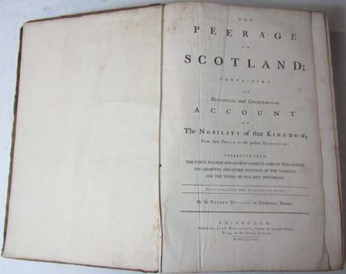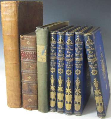 The Right Hon. Benjamin Disraeli, Earl of Beaconsfield, and his times. William Mackenzie, 1881. 4to, 5 volumes, 30 plates, g.e., bookplates to paste-down endpapers, contemporary blue cloth gilt, title-pages very slightly spotted, spines faded and a little bumped, slight bumping and dampstaining to corners; Douglas, Sir Robert The peerage of Scotland... Edinburgh: John Donaldson, 1768. Folio, 10 plates of crests, bookplate to paste-down endpapers, contemporary calf, later spine, a little browning and occasional dust-soiling, a few notes in an early hand, small closed tear to upper margin of 5I2, pp.718-9 lacking page numbers, one leaf (blank?) lacking before plates [ESTC T145746], covers rubbed and bumped, with a couple of shallow gouges; Hamilton, George-James Memorial for George-James Duke of Hamilton... [Edinburgh?: n.p.], 1757. 4to, contemporary calf, a few headers a little shaved, covers and spine a little rubbed [ESTC T118950]; Bell, Henry Nugent The Huntingdon peerage... Baldwin, Craddock and Joy, 1820. 4to, 2 portraits, folding table, bookplate to paste-down endpaper, original? quarter cloth, paper label to spine, some spotting and a little dust-soiling, 3A2 misbound, covers rubbed and bumped, spine faded, label chipped; Pitcairn, Robert Criminal trials in Scotland... Edinburgh: William Tait, 1833. 4to, 3 volumes in 4, 1 plate (Specimens of the MSS), other plates and frontispieces lacking, bookplates to paste-down endpapers, gift inscription in red ink to endpaper of first volume, 19th century red morocco gilt, some spotting, spines faded, a few small white paint specks to covers; Foster, J.J. The Stuarts. Dickinsons, 1902. Folio, 2 volumes, presentation copy of Edition de Luxe signed by the author, portrait, 129 plates and illustrations, 3 coloured, bookplates to paste-down endpapers, original red cloth gilt, occasional dampstaining and spotting, covers a little faded and slightly bumped; 'Blind Harry' [Henry, The Minstrel] The acts and deeds of... Sir William Wallace. Edinburgh: [N.p.] 1758. Small 4to in twos, modern half calf, pages 145-146 lacking but text continuous, pages 317-18 of first section and 53-54 of second section misbound, small hole to page 271 with loss of a couple of letters, tear in upper margin of page 75 with part of the running title lacking, bookplate and laid-down inscription to paste-down endpaper, some browning and a little spotting; Home, Bruce J. Old houses in Edinburgh. Edinburgh: W.J. Hay, [1905?]. Folio, bookplate to paste-down endpaper, green cloth gilt, spine faded; sold not subject to return (16)