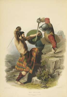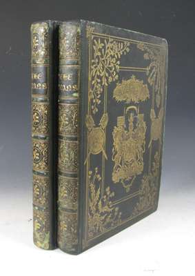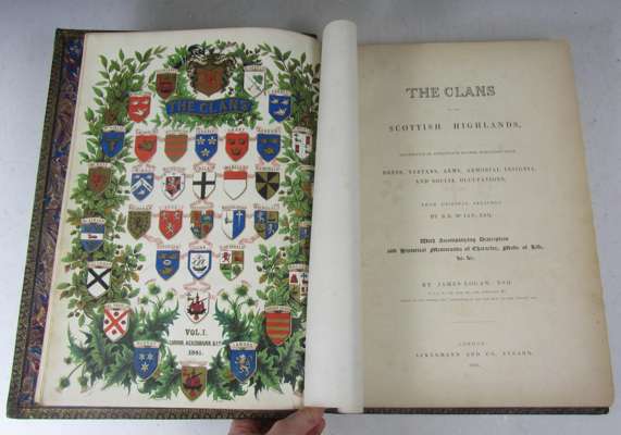 The clans of the Scottish Highlands. London: Ackermann and Co., 1845. 2 volumes, folio, 2 hand-coloured heraldic frontispieces and 72 hand-coloured lithographed plates, original elaborate green morocco gilt, several plates torn along inner margin or torn/cropped along lower margins with occasional loss of text, a little browning and dust-soiling, mostly marginal, some rubbing and slight chipping to covers and spines (2)