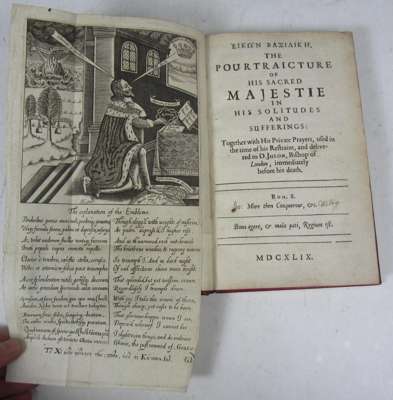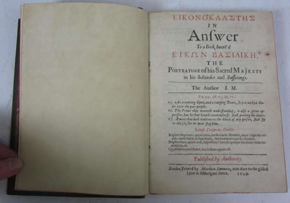Eikonoklastes... London: printed by Matthew Simmons, 'published by Authority', 1649. First edition, small 4to, nineteenth century calf tooled in blind with gilt leaf motifs to corners, first blank lacking, gift inscription to endpaper, rubbed [ESTC R202156, Wing (CD-Rom, 1996), M2112]; [Gauden, John - Charles I of England, attr.] Eikon basilike. [London?: n.p.], 1649. 8vo, folding frontispiece portrait, engraved royal coat of arms, nineteenth century red morocco, gift inscription to endpaper, occasional light dampstaining, rubbing [ESTC R34429, Wing (CD-ROM, 1996), E307] (2)
