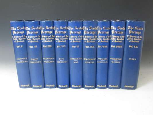 The Scots peerage. Edinburgh: David Douglas, 1904. 9 volumes, coloured frontispiece and 75 full-page plates, original blue cloth gilt, t.e.g., bookplates to paste-down endpaper, some spotting, a little fading and bumping to spines (9)