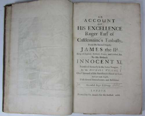 An account of His Excellence Roger Earl of Castlemaine's embassy, from His Sacred Majesty James the IId. London: for the author, 1688. Folio, engraved frontispiece, portrait and 15 plates (1 folding), contemporary calf, portrait of Mary of Modena frayed, extremities worn