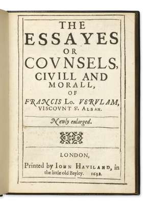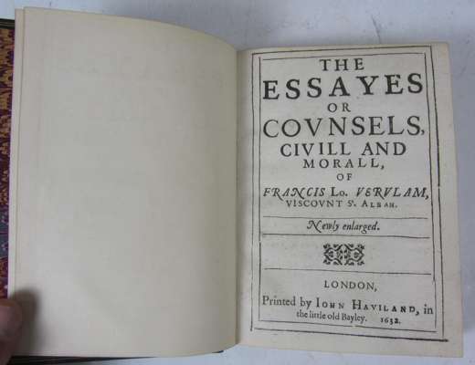 The essayes or counsels. London: John Haviland, 1632. 4to, lacks blank leaves A1 and 3C4, 19th century black morocco, [ESTC S100364], rubbed,