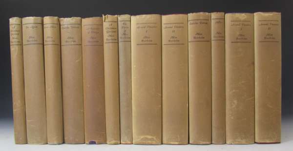 The works. W. Heinemann, 1922-24. Number 429 of 780 sets signed by Max Beerbohm, vol. 1, [2-3], [?4], 5-10, and a duplicate of vol. 5, 6, 8, 9, (the volumes unnumbered), original multi coloured cloth, dustwrappers, volume ?4 [And even now] without dustwrapper, the volume signed by Beerbohm [The works], discoloured title; Mare, Walter de la Peacock Pie. London: Constable, 1913. First edition, 8vo, original blue cloth, dustwrapper with slight loss at head of lower wrapper & slight wear, later slipcase; Grimm, Brothers Grimms' other tales. Golden Cockerel Press, 1956. Number 175 of 500 copies, wood-engravings by Gwenda Morgan, original maroon cloth, t.e.g., later slipcase; Beckford, William Vathek. Nonesuch Press, 1929. Number 478 of 1050 copies, plates by M.V. Dorn, original vellum-backed cloth, later slipcase; Fiera, Battista De iusticia pingenda. London: Lion & Unicorn Press, 1957. No. 113 of 200 copies, morocco-backed boards, later slipcase; Morris, William Art and the beauty of the earth. Chiswick Press, 1898. 8vo, original cloth-backed boards, boards somewhat soiled, later slipcase; Landor, Walter Savage Dry sticks, fagoted. Edinburgh: J. Nichol, 1858. First edition, 8vo, original green cloth, slightly spotted, head of spine rubbed; Landor, W.S. The sculptured garland. London: The Dropmore Press, 1948. 4to, number 71 of 300 copies, wood engravings by Iain Macnab, brown half morocco, gilt, t.e.g., uncut, head of spine slightly rubbed, boards spotted, slipcase; Landor, W.S. The sculptured garland. The Dropmore Press, 1948. 4to, number 101 of 300 copies, wood-engravings by Iain Macnab, brown half morocco gilt, t.e.g., uncut, dustwrapper slightly spotted & with small tear Super, R.H., The publication of Landor's works. London, 1954. 8vo, wrappers; Original watercolour sketches of W.S. Landor's birthplace at Warwick and Villa at Fiesole, each 6 x 8cm., mounted on board, slightly spotted; Coppard, A.E. Silver circus. 1928. Number 111 of 125 copies signed by the author, 8vo, original vellum, t.e.g., dustwrapper; Cheyney, Peter Sorry you've been troubled. 1942; [Idem] The stars are dark. 1943. 2 copies; [Idem] The dark street. 1944; [Idem] Sinister errand. 1945; [Idem] Dark hero. 1946; Sholokhov, M. Harvest on the Don. 1960. First English edition, dustwrapper; Ashbee, C.R. Conradin: a philosophical ballad. Essex House Press, 1908. 4to, limited to 250 copies, quarter cloth; and others, literary; sold not subject to return (quantity)