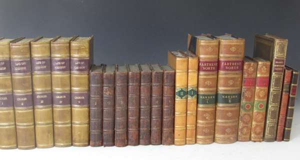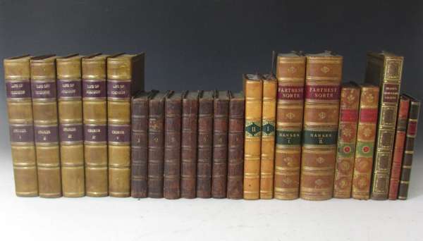 Boswell, James The life of Samuel Johnson... John Murray, 1831. 5 volumes, 8vo, portraits, modern calf, advert leaves bound into volume 1, some foxing, spines faded; The Spectator J. Tonson, 1733. 7 volumes, eleventh edition, contemporary speckled calf, bookplate in volume 3, title-pages clipped, joints and spines cracked and rubbed, labels lacking; Nansen, Fridtjof Farthest north. Westminster: Archibald Constable and Company, 1897. 2 volumes, 8vo, first English edition, folding maps, modern half-calf, bookplates, some spotting, spines faded; Macpherson, James The poems of Ossian. Edinburgh: G. Mundie..., 1792. 2 volumes, 8vo, contemporary tree calf gilt, bookplates to paste-down endpapers, spines faded, rubbed and a little soiled; Johnson, Samuel The poetical works. London: W. Osbourne, 1785. 8vo, contemporary tree calf rebacked, bookplate and previous owner's signature to paste-down endpaper; and 3 others, sold not subject to return (20)