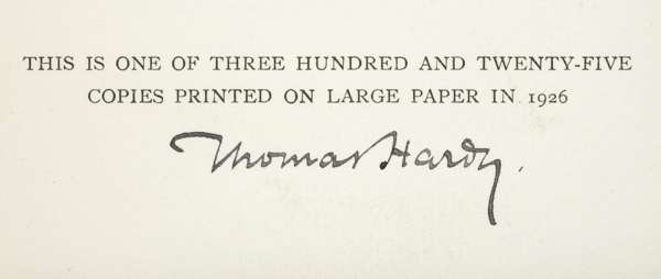 Tess of the D'Urbevilles. London: MacMillan and Co., 1926. One of 325 copies signed by the author, engraved frontispiece, many pages uncut, original quarter vellum gilt, dust-jacket slightly chipped and worn, minor bumping to corners