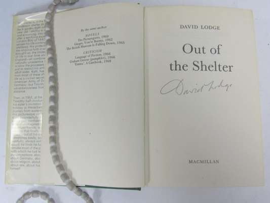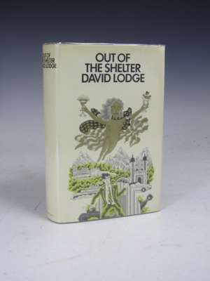 Out of the shelter. London: Macmillan, 1970. First edition, signed by the author on title, original green cloth, dustwrapper, dustwrapper with small nick to foot of spine, inscription on slip of paper "For Bruce Ritchie, with very best wishes, David Lodge, January 2009" loosely inserted