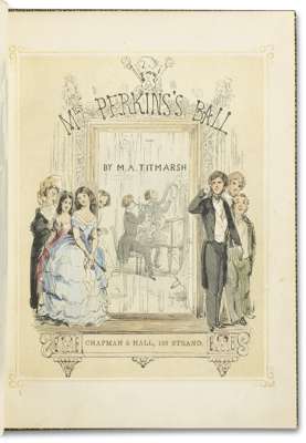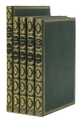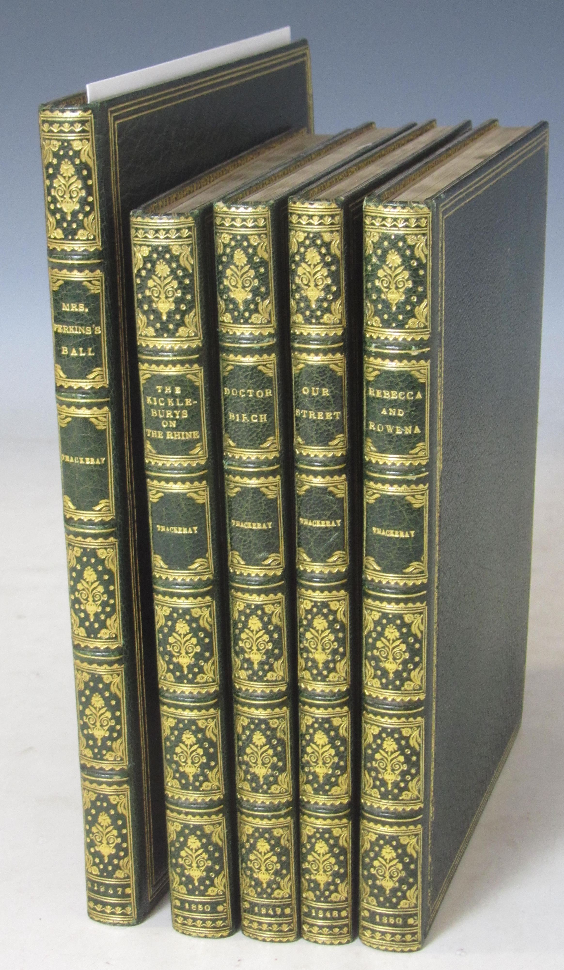 Mrs Perkins's Ball. Chapman and Hall, [1847], first edition, first issue, 22 coloured plates including illustrated title-page and one folding plate; [Idem] Our Street. Chapman and Hall, 1848, first edition, 16 coloured plates including illustrated title-page, 1p. publisher's adverts at rear, original upper and lower wrappers bound in at rear; [Idem] Doctor Birch and his young friends. Chapman and Hall, 1849, 16 coloured plates including illustrated title-page, 1p. publisher's adverts at rear, original upper and lower wrappers bound in at rear, some slight dampstaining; [Idem] Rebecca and Rowena. Chapman and Hall, 1850, first edition, 8 coloured plates after Richard Doyle, 1p. publisher's adverts at rear, original upper and lower wrappers bound in at rear; [Idem] The Kickleburys on the Rhine. Smith, Elder, & Co., 1850, first edition, 15 coloured plates including illustrated title-page, 2pp. publisher's adverts at rear, original upper and lower wrappers bound in at rear; all 8vo, rebound in full green morocco by Riviere, spines gilt in compartments, some soiling to original wrappers (5)
