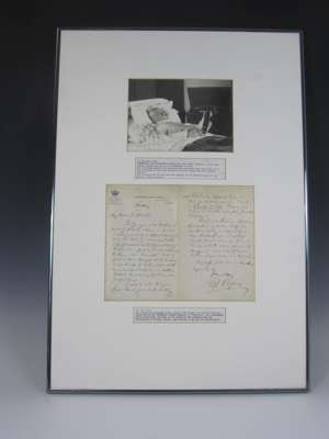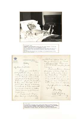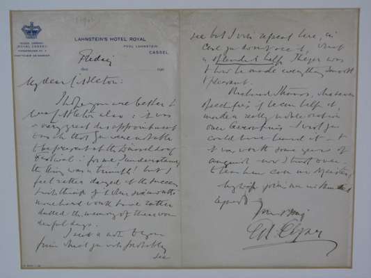 Autograph letter signed from Sir Edward Elgar to Alfred Littleton, [on 23rd May 1902], on Lahnstein's Hotel Royal headed paper, c.270x210mm, praising the German premiere of Gerontius and acknowledging the approbation of Richard Strauss, Elgar writes: I wish you could have heard it; [with] a signed photograph of a bed-ridden Elgar in his final months, inspecting a gramophone record, c.140x200mm, inscribed To W L...[?] Streeton/ Kind Regards/ Edward Elgar/ Dec 1933; both items framed together in mount