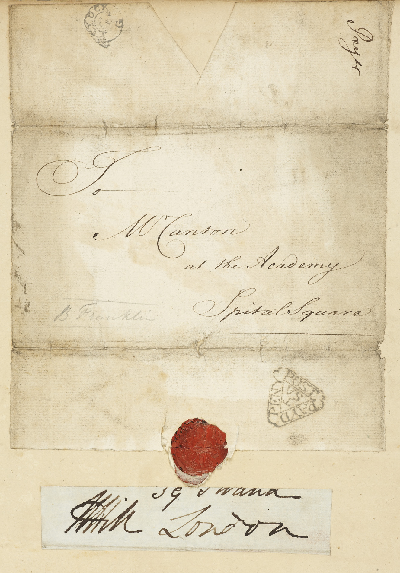 Two album sheets with 11 paste-down autographs, c.1740 and later, including an autograph envelope believed to have been written by Benjamin Franklin, 18.5x15cm