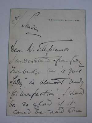 Note: The Channel Island born Emilie Charlotte Le Breton, or Lillie Langtry as she was popularly known, was a well-known actress in the late 19th and early 20th centuries. She impressed society with her ability to enchant and became mistress to the Prince of Wales between 1877 and 1880. Early in her career, Langtry discovered that theatrical touring in North America could be both exciting and profitable - it was her connections, rather than her acting, which fascinated the crowds. The letter to Stephenson was written at the end of 1900, when Langtry became lessee and manager of the Imperial Theatre in London. She also successfully secured the role in A Great Lady.