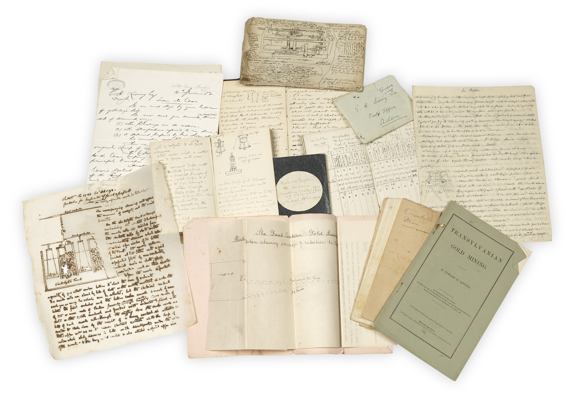 13 autograph notebooks, in pencil and black ink, containing detailed notes on laboratory experiments on various subjects including metallurgy, speculative ideas for further research, work on his Patent Gas Indicator (1870s), notes on the Lewis Thompson Calorimeter, reports and results of mining assays, mostly relating to coal deposits in South Wales and Queensland, and engineering notes relating to Siddeley and Wolseley motorcars, including many diagrams and sketches, 12mo, most with labels on spines; together with more than 100 leaves of further loose notes and letters, including letters received (some carbon copies), drafts of letters sent, and other papers, relating to subjects including his patented inventions and his involvement in various mining projects such as gold mining in Kalgoori, Western Australia, Southern Australia, and Transylvania, a small quantity of family correspondence, and notes from printed sources; also with 10 printed items including pamphlets by Liveing; c.1874-1923, nicks and tears, some dust staining