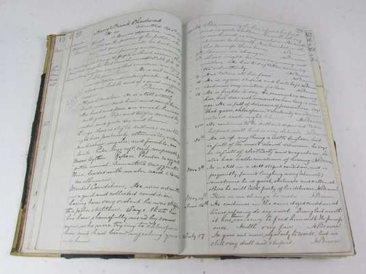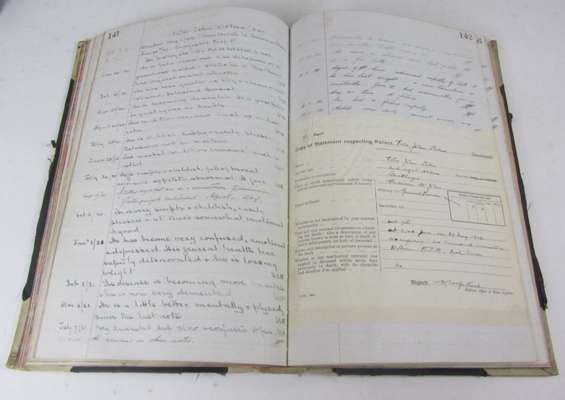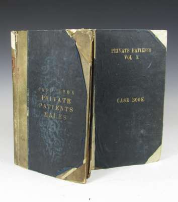 Two manuscript medical case books from the Berkshire Asylum, detailing the cases of mentally ill patients: Private Patients Males, c.1891-1916, c.200 manuscript pages of patient notes and pasted-down statements of death, plus an index, including 5 copies of letters sent by one patient to his parents, another from a patient to a member of the Church Army Corps and newspaper clipping relating to individual cases; Private Patients, volume 3, c.1917-1924, c.190 manuscript pages of patient notes and pasted-down statements of death, plus an index; both original half vellum gilt, rubbed and worn, writing clear and often legible (2)