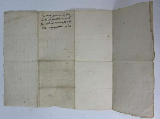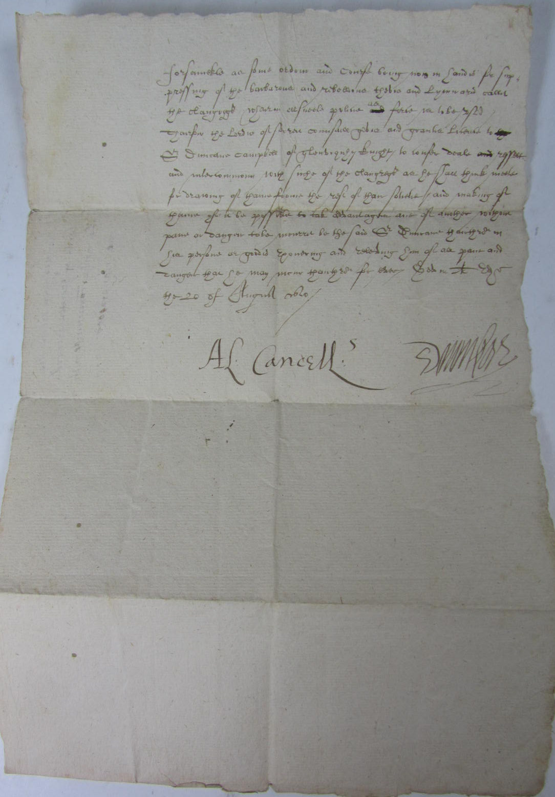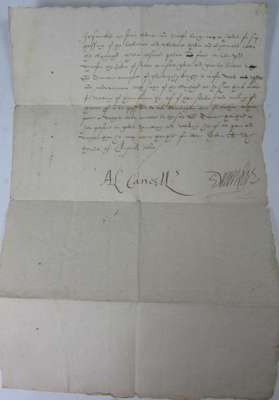 Manuscript license, dated 1619 [possibly 1629], granted to Duncan Campbell of Glen Orchy, giving him permission to 'intercommune' with certain members of the Clan Gregor, 350x200mm., with twelve lines of writing and signatures possibly of James Primrose (clerk to the Privy Council [d.1641] and A L. Cancell.s, which could be Alexander Seton, the Lord Chancellor of Scotland, 1604-1622, title to verso, folded into 8, 4 small wormholes affecting one letter and two small holes along centre fold, affecting one word