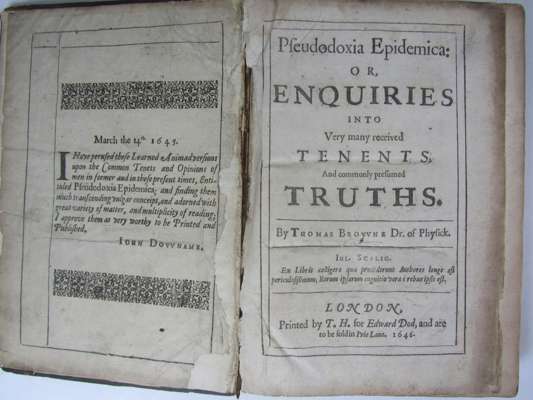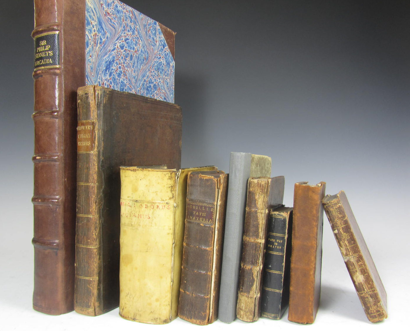 Pseudodoxia epidemica. Edward Dod, 1646. 4to, contemporary calf, [Wing B5159], leaf before title frayed and laid down, title almost detached, rebacked, corners worn; Penn, William An account of W. Penn's travails in Holland and Germany. T. Sowle, 1694. 8vo, later calf, lacks K8, [ESTC R18015; Wing P1244]; Achilles Tatius De clitophontis & leucipes amoribus. Heidelberg, 1606. 8vo, Greek & Latin text, fine woodcut title border, 18th century calf, cover detached; Sidney, Sir Philip Sir Philip Sidney's Arcadia, moderniz'd by Mrs Stanley. [1725. Folio, modern half calf; and 5 others; sold not subject to return (9)