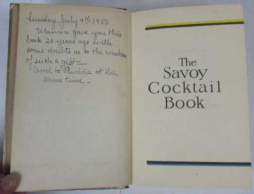 The Savoy cocktail book. London: Constable & Company, 1930. 8vo, original cloth-backed gilt boards, gift inscription to endpaper: "Mama gave you this book 20 years ago with some doubts as to the wisdom of such a gift..." and instructions for a "Solita Terra" cocktail written on note pages at end of book, slight rubbing, some splitting to lower joint