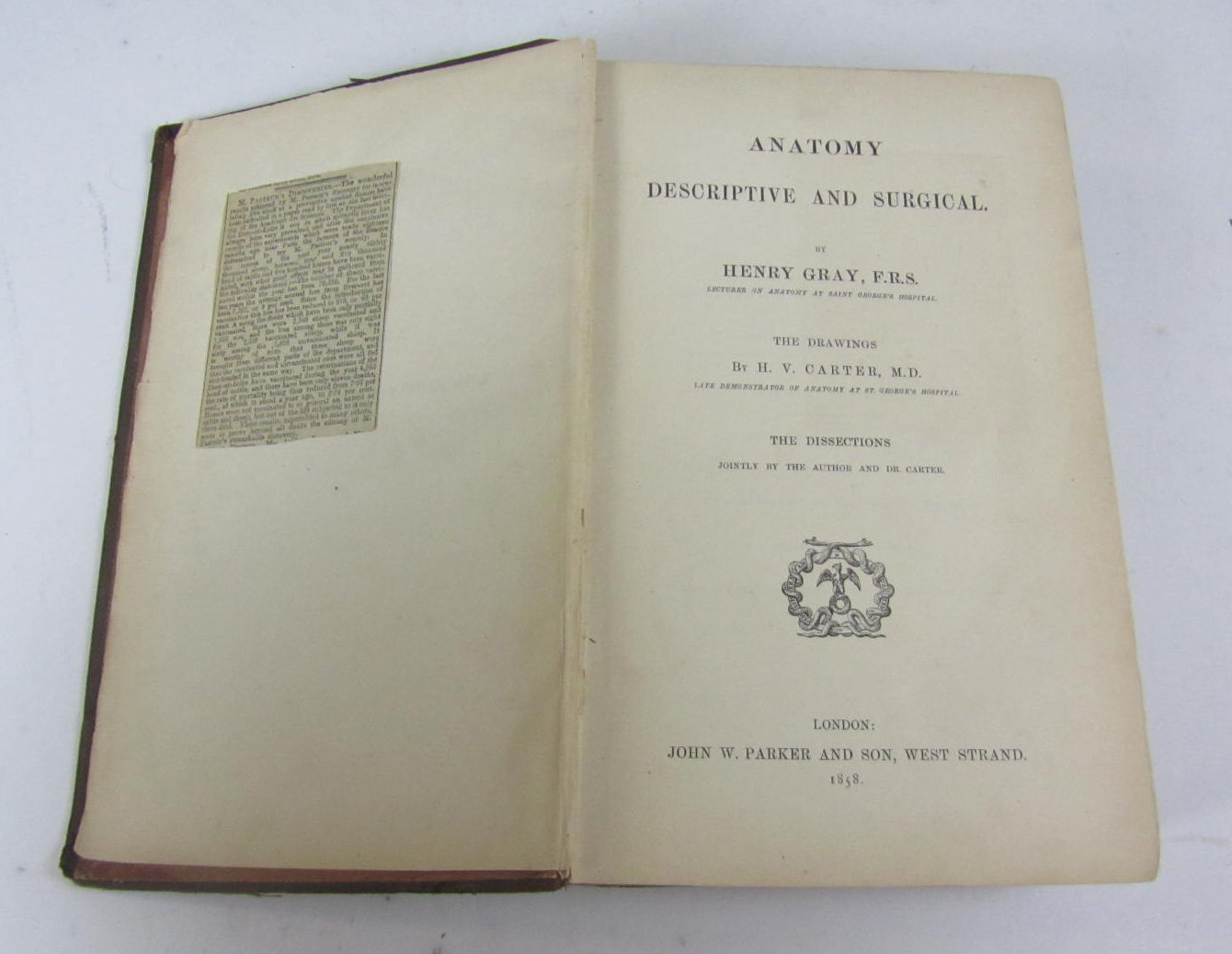 Anatomy descriptive and surgical... London: John W. Parker and Son, 1858. 8vo (257 x 158mm.), illustrations, original brown cloth, spine lettered in gilt, front flyleaf and half-title detached, final advertisement leaf detached, occasional light damp-staining, binding rather worn, spine detached [Garrison & Morton 418; Norman 939]