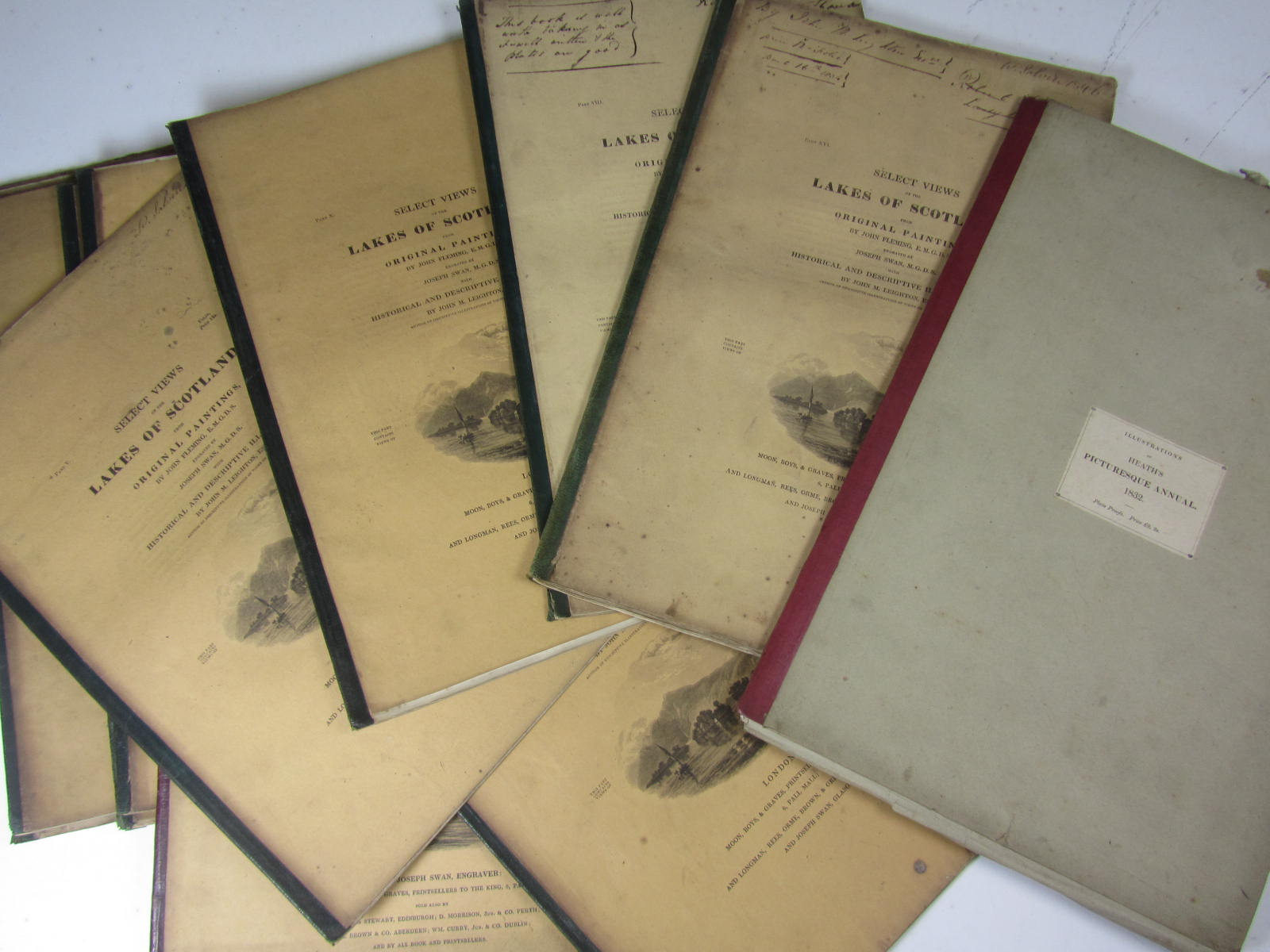 Illustrations of Heath's picturesque annual. 1832. "Plain Proofs", from drawings by Clarkson Stanfield. London, 1832. Folio, engraved title and 25 engraved plates, loose as issued in cloth-backed board portfolio; Leighton, J.M. & J. Fleming. Select views of the lakes of Scotland. Glasgow: J. Swan, 1830. Folio, parts 1-6, 8, 10 and 14-16 only, engraved plates on india paper, original morocco-backed printed pictorial wrappers, wrappers slightly soiled; Scrap album Oblong folio, half morocco, 1857; 2 very defective volumes; and 11 hand-coloured prints, slightly dust-soiled (loosely inserted in the first item); sold not subject to return