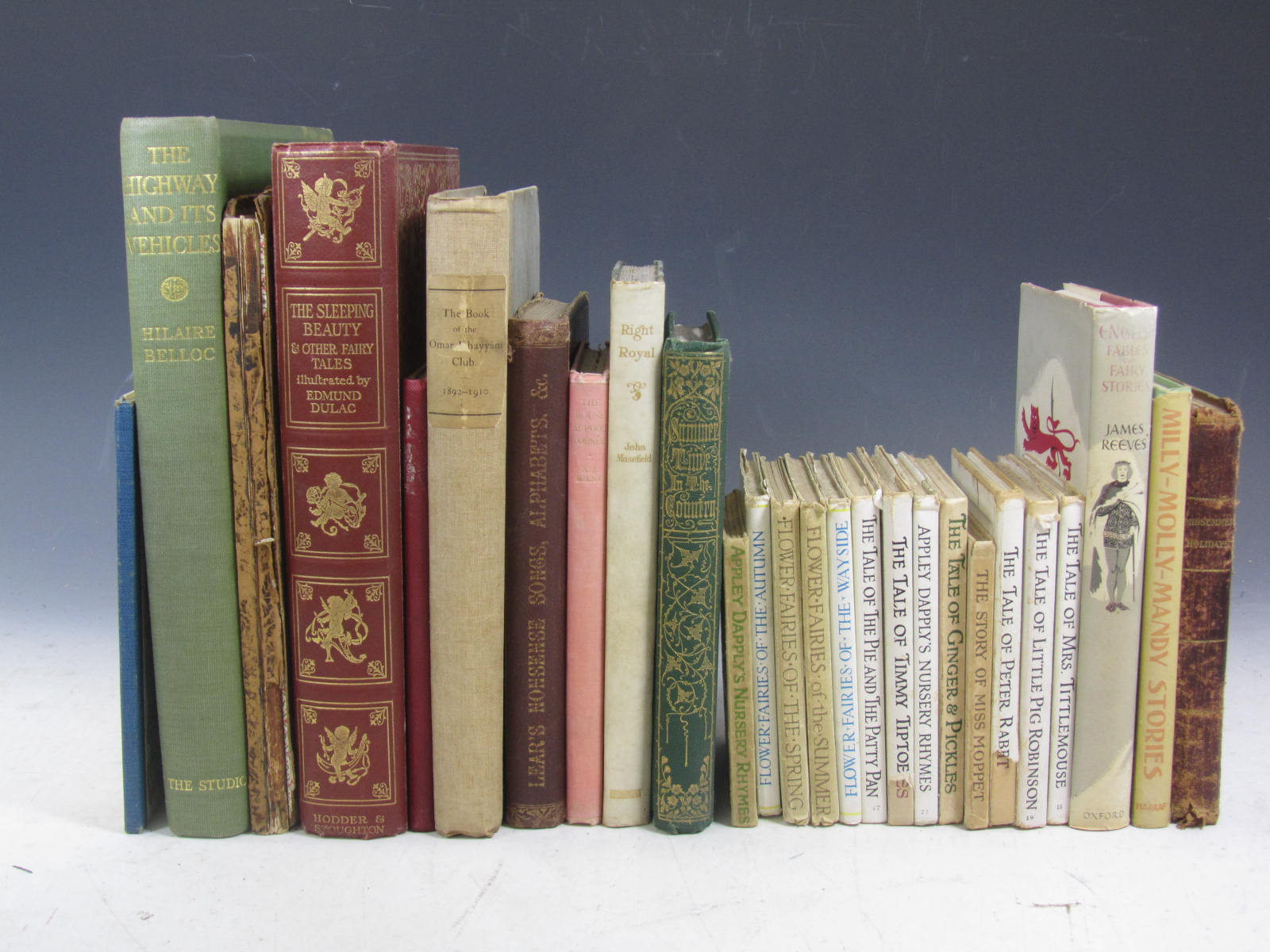 The house at Pooh Corner. Methuen & Co., Ltd, 1928. First edition, 8vo, pink cloth gilt; Lear, Edward Nonsense songs, stories, botany and alphabets. R.J. Bush, 1871. First edition, patterned coloured boards with red cloth spine, some rubbing and soiling; Quiller-Couch, Sir Arthur - Dulac, Edmund The sleeping beauty and other fairy tales. Hodder & Stoughton, [n.d., 1910?] 4to, red-brown morocco with rococo gilt tooling, previous owner's signature to endpaper, some pages loose, hinges weak, binding a little rubbed; Omar Khayyám Club The book of the Omar Khayyám Club. Printed for the members, 1910. 4to, number 134 of 181 copies, gift inscription to endpaper; Bacon, Mary Ann - Jones, Owen Fruits from the garden and field. Longman & Co., 1850. 8vo, 12 colour illustrations and illuminated text by Owen Jones, original? embossed leather, covers detached, rubbed; Jerrett, Myrtle Selwyn the sealion. Ipswich: W.S. Cowell Ltd, 1948. Oblong 8vo, original covers, coloured lithographs; and a small quantity of others, sold not subject to return (quantity)
