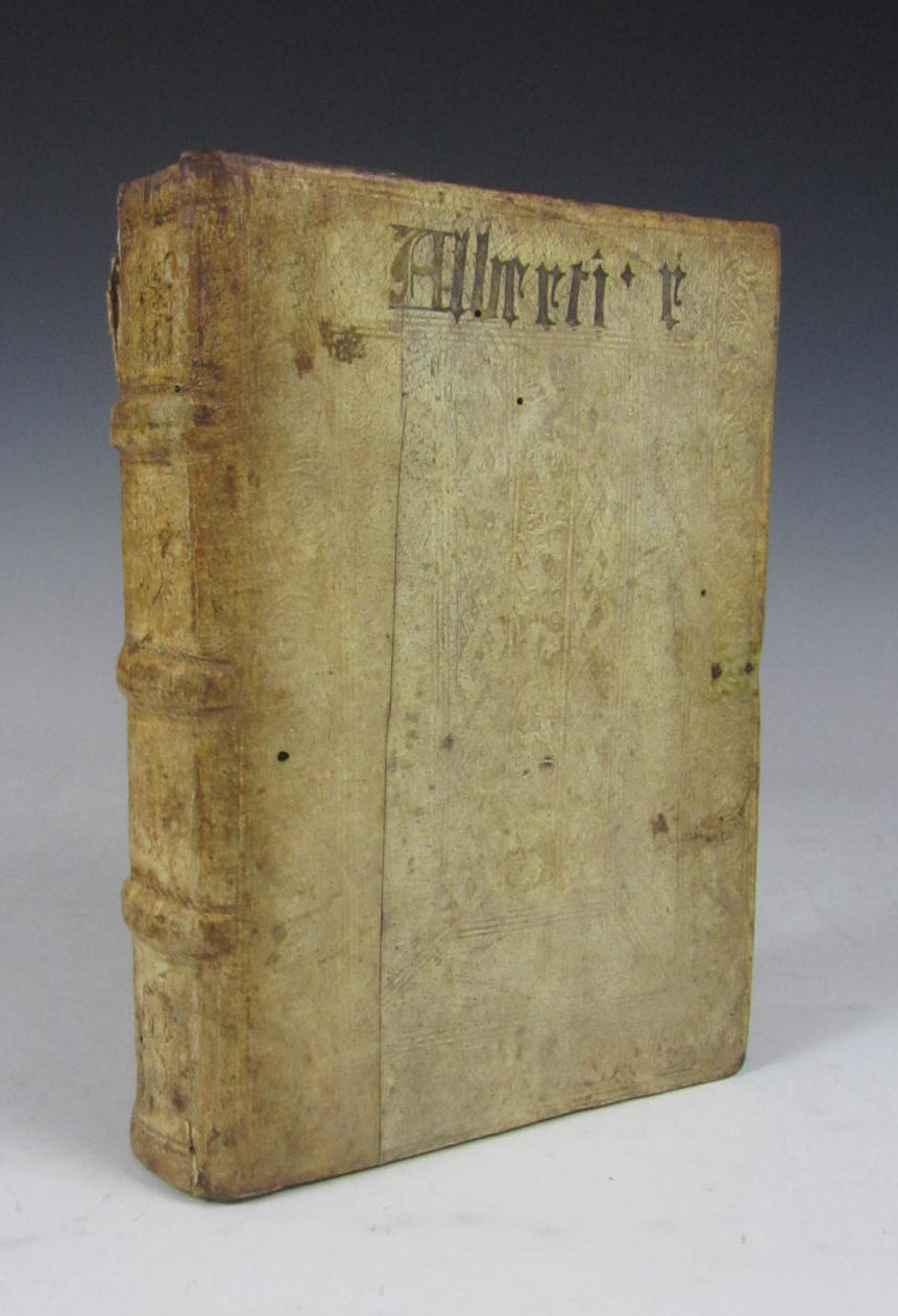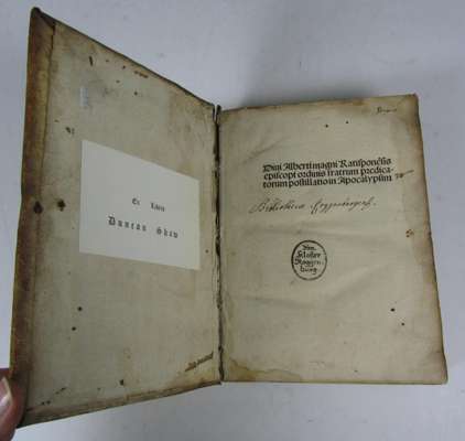 Postillatio in apocalypsim. [Basel: Jakob Wolff..., 1506] 8vo, contemporary blindstamped pigskin over wooden boards, author's name to upper cover, repaired with a little worming, small wormholes throughout with loss of some letters, slight dampstaining and darkening to text and covers [USTC 640311, listing 16 copies in libraries in Germany and Austria]